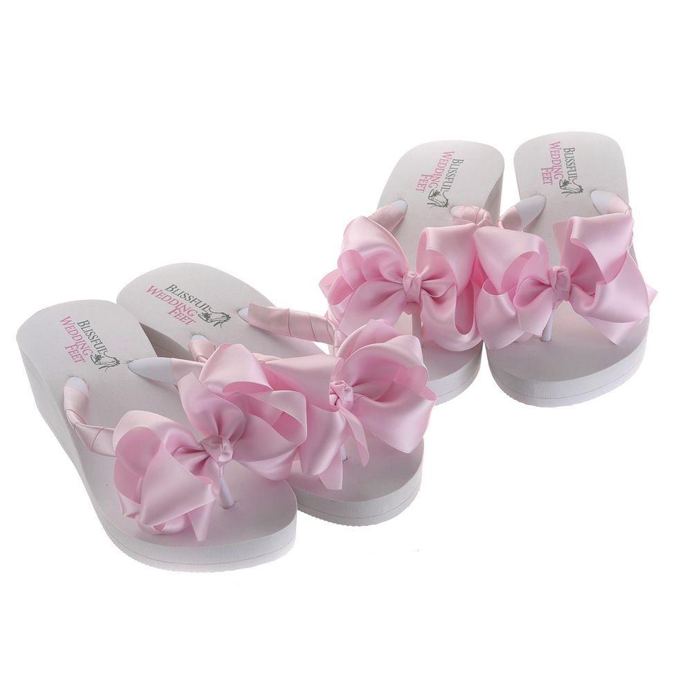 Our high wedge Flip Flops have been specially designed with a 5cm heel height.  They have been made with the softest sole, Satin Bound Straps and a stunning, perfectly tied huge Boutique Bridal Bow to match your dress. They are available in almost every colour you can think of, though do give us time to source a perfect match for your Dress colour.  Bridesmaids Flip Flops will save your feet throughout the Wedding Day. You can choose other embellishments to match your dress and you can also choose other satin ribbon colours if you wish.  We will customise them just for you.