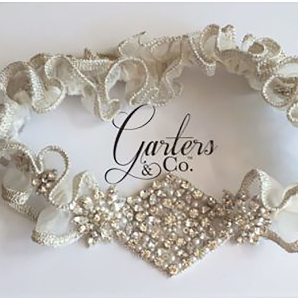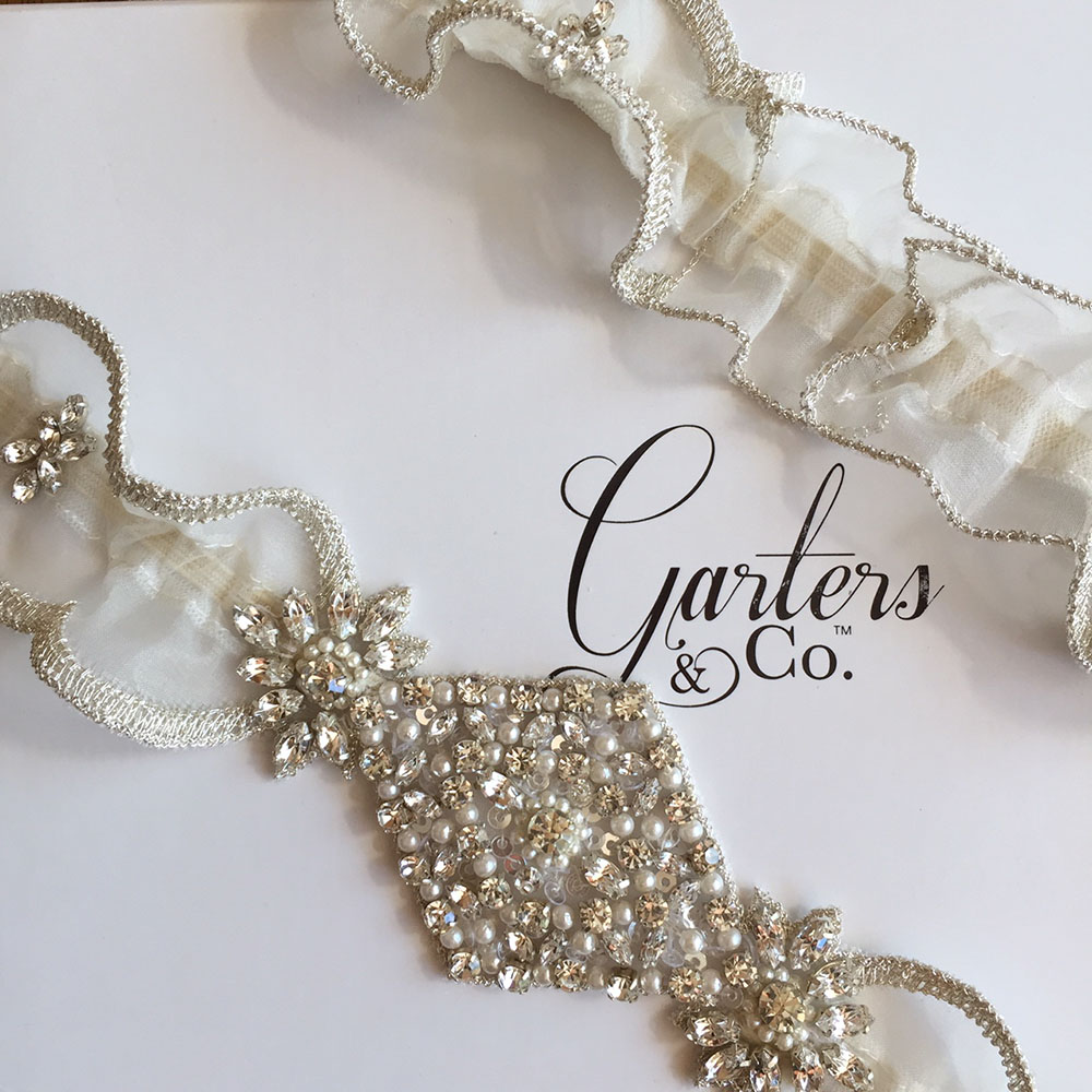 Our garter has a matte silver embroidered edge to the top and the bottom of our gently gathered ivory organza garter. This embroidery complements the beautiful rhinestones in your heirloom piece. We have added a rhinestone and pearl design all around the garter, adding a luxurious touch.