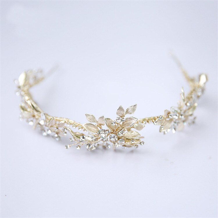 A beautiful display of delicate, luminous Gold LeavesĀ and Rhinestones. The Gold Leaf and Rhinestone Wedding Crown is a luxurious Bridal Hair Vine for your special Day. Handcrafted into a flowing design and interspersed with bright sparkling Rhinestones. All the Rhinestones have been carefully cut into pretty Marquis and Princess cut shapes. They add a balance of sparkle and a gorgeous touch of Bling for your Wedding Day.