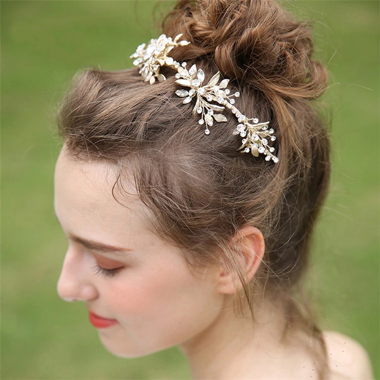 Our Gold Leaf with Rhinestone Bridal Crown has been carefully handmade to complement any Bridal Hairstyle. Whether you choose an Updo Hairstyle or choose to leave your Hair flowing naturally. Our Bridal Hair Vine is extremely flexible so you can create the perfect shape to sit comfortably into your hairstyle. Your Hairdresser can easily mould this headpiece into any shape to suit the hairstyle of your choice.