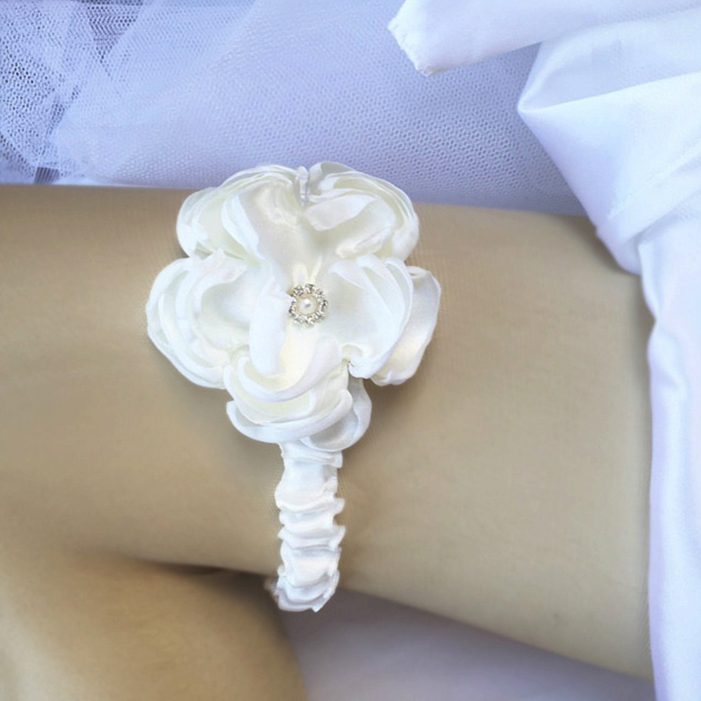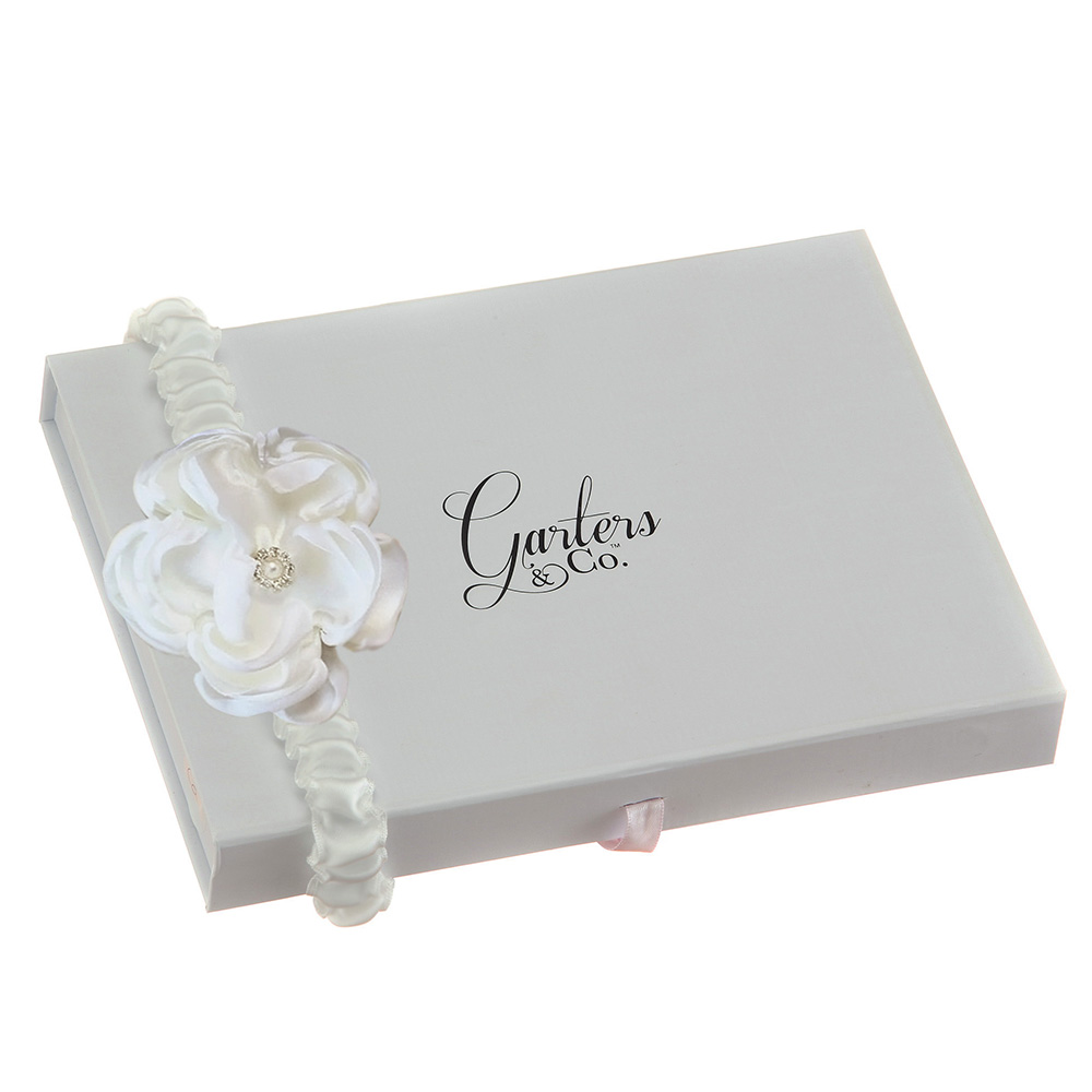 Our soft, sleek and beautifully over-sized handmade rose has been created with layers and layers of silky satin. Nestled inside is a tiny pearl and rhinestone embellishment stitched carefully into the middle.  The stunning rose sits snugly against the 2cm wide satin Wedding Garter in Bridal White. Stephanie Wedding Garter is simple, elegant and very feminine.
